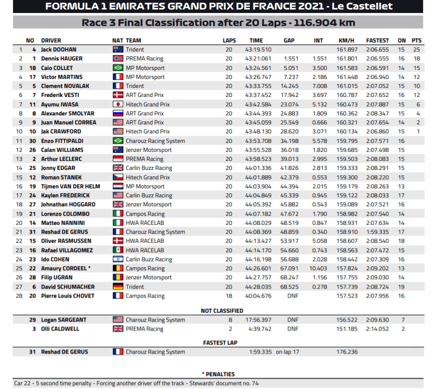 He’d caught up with five laps to go and was told to go for it over team radio. Doohan needed no second invitation, launching past the PREMA down the main straight. Hauger kept on the Trident’s tail and was encouraged over team radio to fight for the position, as opposed to settling for second, but in the end, there was nothing he could do.