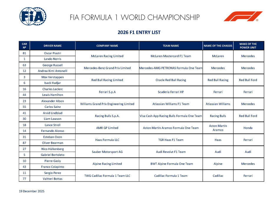 The FIA shared the F1 2026 entry list with number changes for few drivers, along with team name changes and power unit as well.