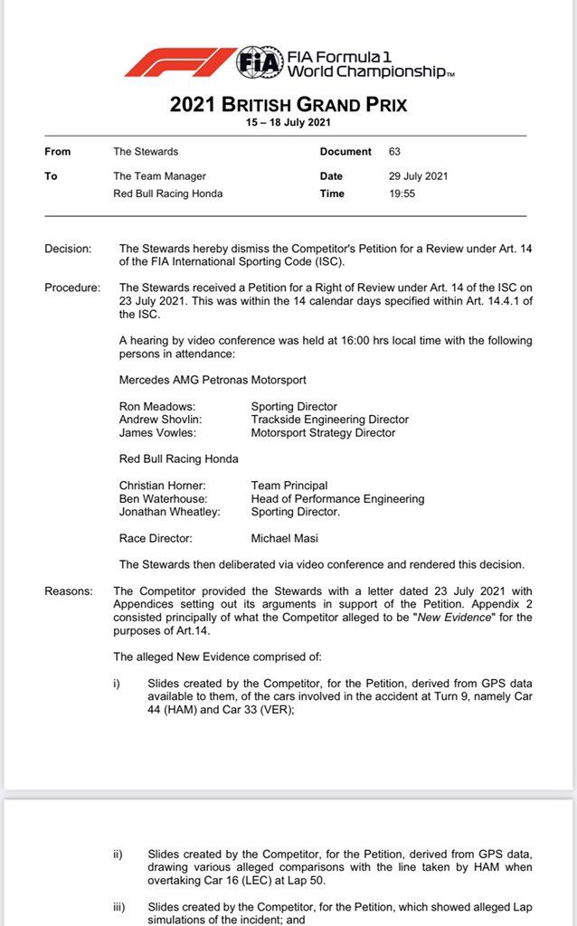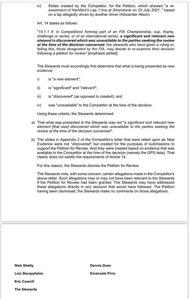 While dismissing the petition, the stewards also took note of certain allegations made in a letter by the team when filing the review. While noting it and agreeing for the review, the stewards wished to make no comments on those allegations.