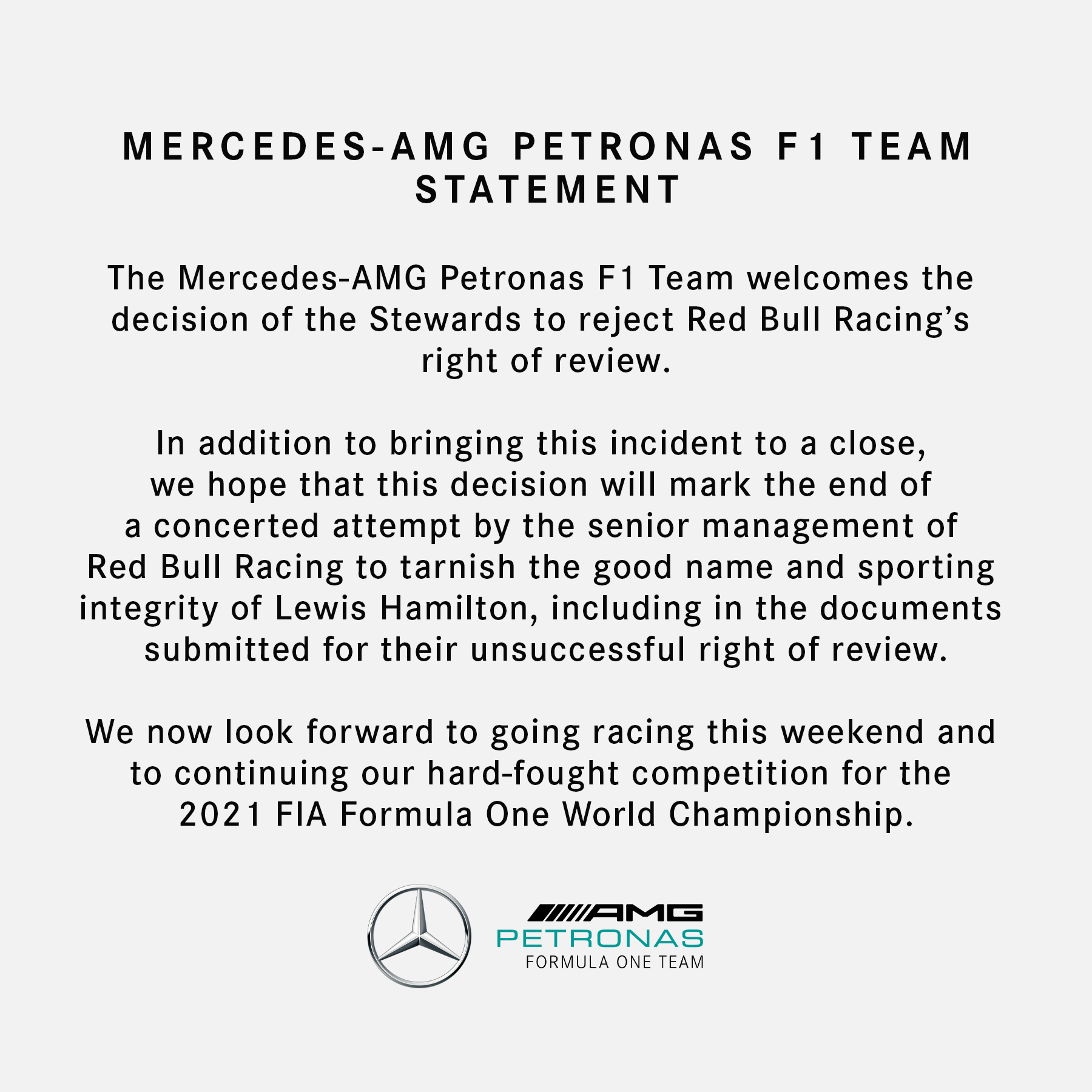 UPDATE: Mercedes released a statement where they wished to close the matter and also end the tirade against Hamilton from the Red Bull senior management, especially in the letter of their right to review presented to the FIA.