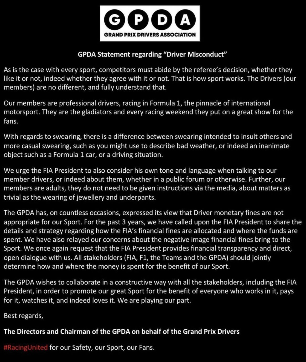 The GPDA has released a strongly worded statement and has brought light into discussion that F1 drivers want around transparency of the monetary fines.