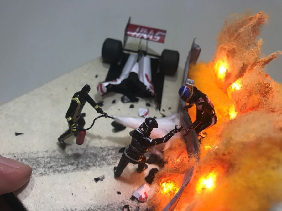 Elsewhere, a motor racing enthusiast named Fabrica de Pilotos – https://www.facebook.com/fabricadepilotosdiorama/?_rdc=2&_rdr – recreated the Grosjean crash moment and aftermath in a beautiful presentation.