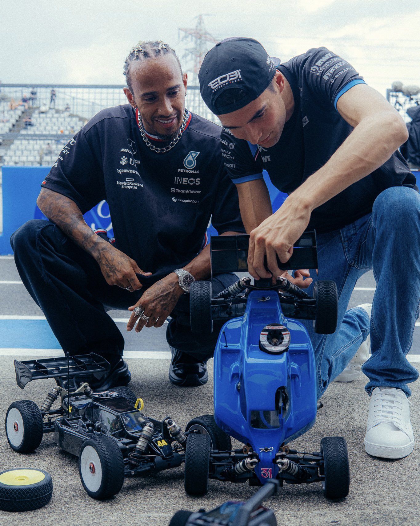 Hamilton: “Yeah, so Esteban and I had planned while ago, that while we’re here, we’ll get our remote control cars together and have a bit of a race in the pit lane. For me, it was very reminiscent of when I was a kid on Blue Peter, and it was really cool, because we all share, more in common than we probably think, other than the fact that we’re pure racers. But it’s very rare that we all get to do things like that, so it was it was fun. They were run on petrol but I thought they were going to be electric. That’s what our race when I was a kid. I raced electric and petrol and it was Kyosho. It’s basically an evolution of the car that you’ll see, like Senna had and I had the same car as Senna when I was younger. And he’s mega at it.”