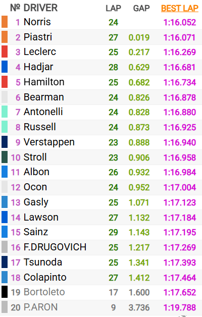 Alpine’s Franco Colapinto was 18th from Sauber’s Gabriel Bortoleto, who did not have a solid outing after moments at two different corners which forced him wide onto the tarmac run-off. Teammate Paul Aron was 20th – filling in for Nico Hulkenberg – but engine trouble ended his session early.