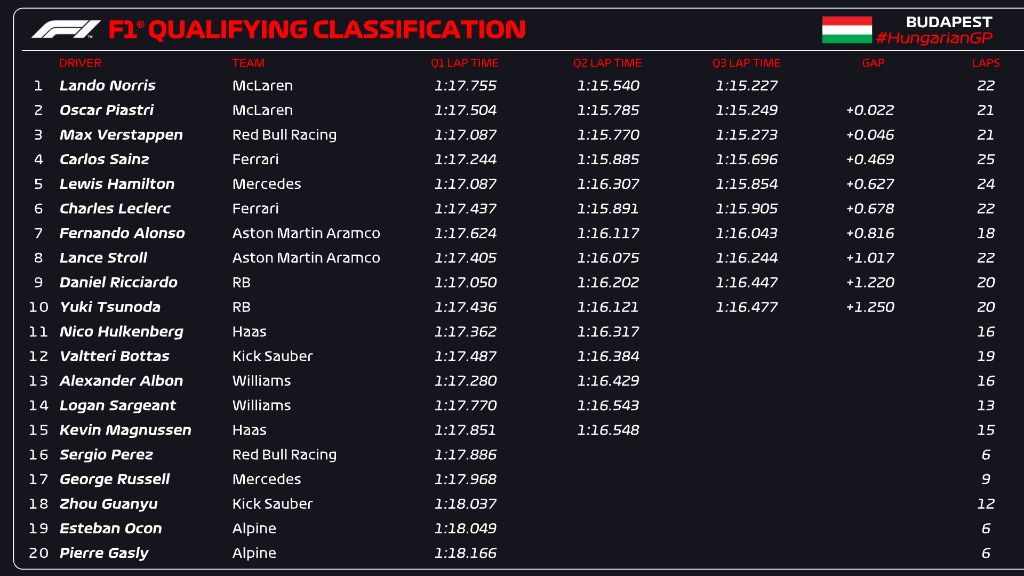It was McLaren 1-2 under the red flag as Verstappen decided not to go out again. In fact, the re-start didn’t have much of a change as Norris took pole in F1 Hungarian GP by 0.022s margin from teammate Piastri (1m15.249s) and Verstappen (1m15.273s).