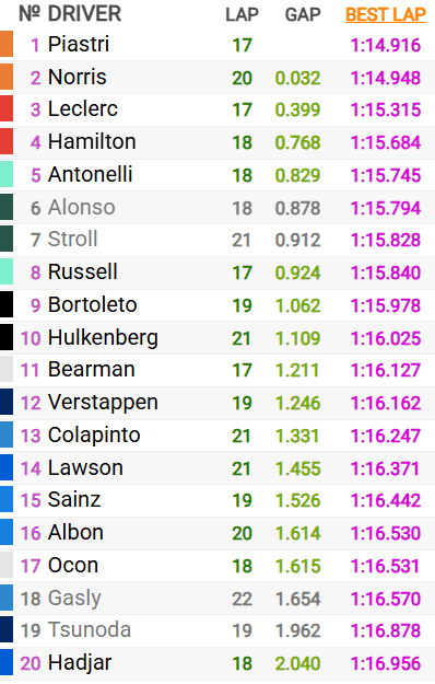 The Silverstone-based team continued their good run with Fernando Alonso ahead of Lance Stroll in sixth, as their high downforce set-up put them in good spot. Mercedes’ George Russell was eighth from Sauber’s Gabriel Bortoleto, in an improved run from the Brazilian after bad Friday.