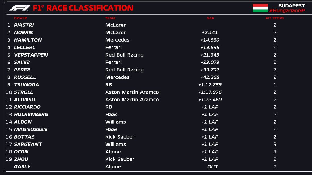Oscar Piastri registered his first F1 win in Hungarian GP in a McLaren 1-2 with Lando Norris second ahead of Lewis Hamilton.