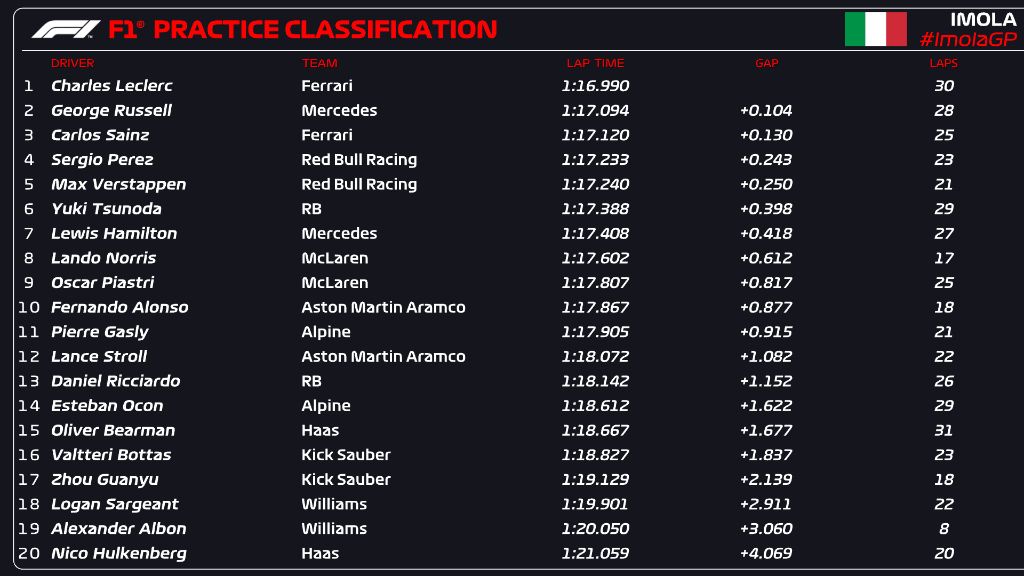 Charles Leclerc set the pace in FP1 of F1 Imola GP with Carlos Sainz third behind George Russell, with no Red Bull in the Top 3.