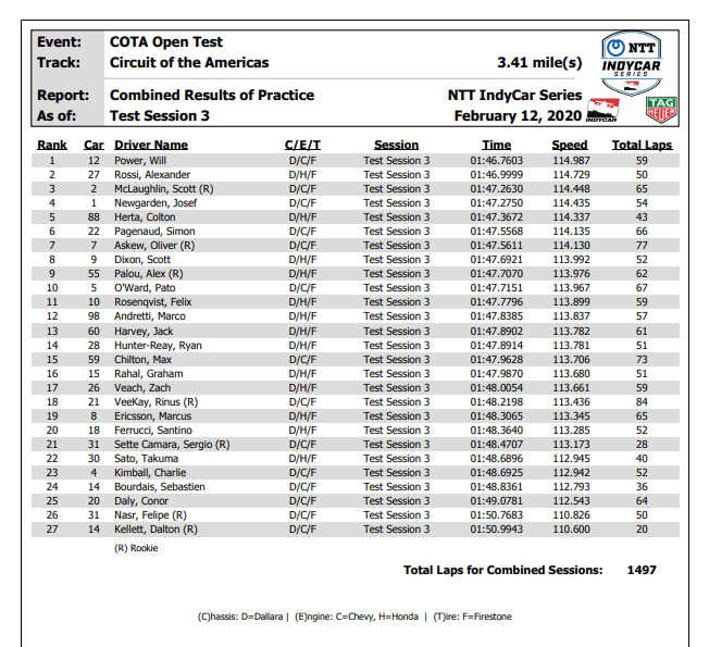 Running for Thursday was considered due to the lack of it on Tuesday and Wednesday, but it was decided that such measures were not necessary. Several IndyCar rookies will be running in the coming days at Texas Motor Speedway, but aside from that, there won’t be much testing until the season opener at St. Petersburg in March.