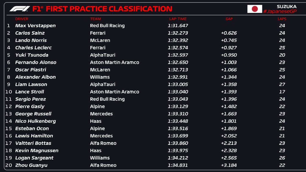 After the blip in Singapore GP, Red Bull’s Max Verstappen was back on top in FP1 of F1 Japanese GP at Suzuka after setting a 1m31.647s lap from last race winner Carlos Sainz in the Ferrari, who was 0.626s off on the soft compound run in slightly cloudy conditions.