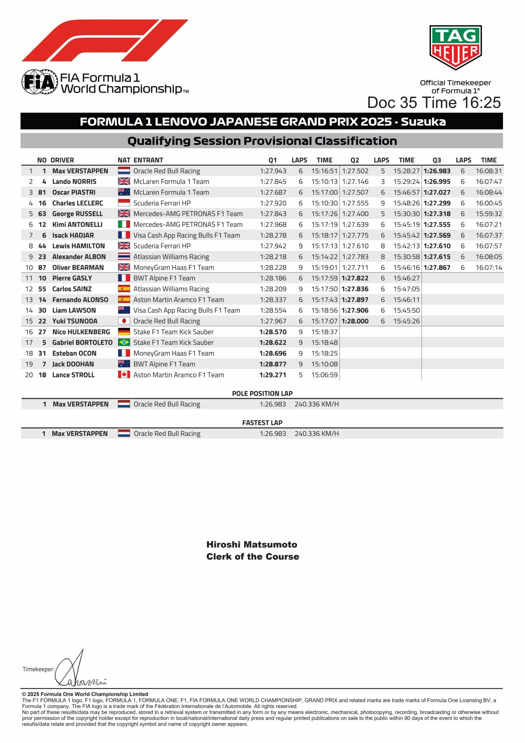 The final run changed the course. It was Norris who took it from Piastri first but then Verstappen pumped in his best lap of 1m26.983s to take a surprise F1 pole in Japanese GP in Honda’s home event. He set a new lap record to beat Norris (1m26.995s) by 0.012s, who picked up after bad first lap.
