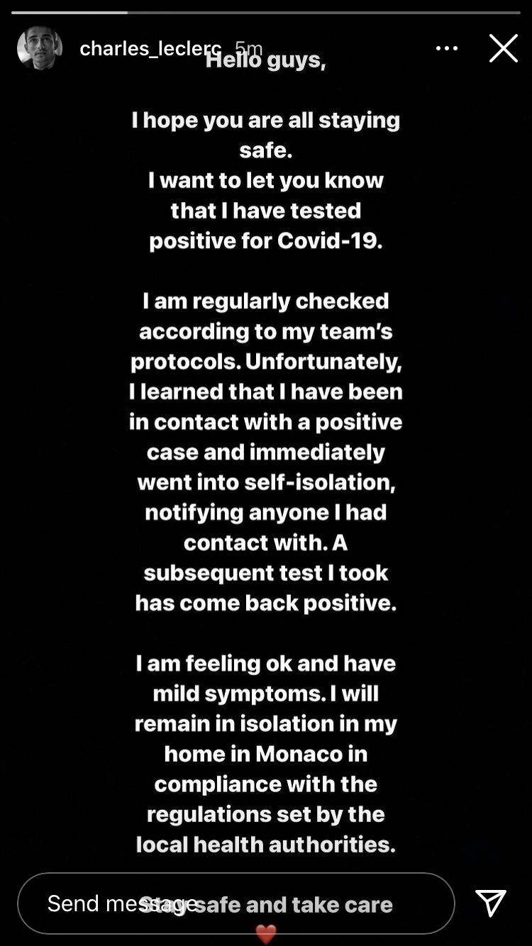 Days after McLaren confirmed a COVID-19 positive result for Norris, his friend Leclerc is the latest to have caught the virus. He got it from a close contact, who tested positive. The Monegasque immediately self-isolated after getting the news of his positive test.