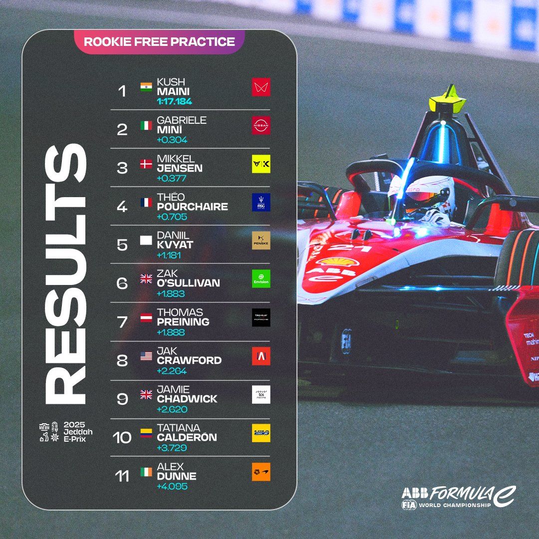 Kush Maini sets pace in Formula E rookie session in Jeddah EPrix ahead of Gabriele Mini and Mikkel Jensen.