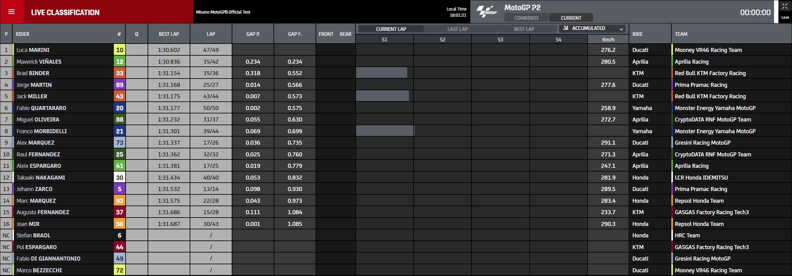 After what could prove a pivotal Grand Prix at Misano in terms of the title fight, MotoGP got back on track on Monday for what could prove a pivotal test too. Topping the timesheets was Luca Marini (Mooney VR46 Racing Team) on his 47th lap of 49 in the afternoon session, deposing Maverick Viñales (Aprilia Racing) as the two duelled it out for top honours. Brad Binder (Red Bull KTM Factory Racing) was third quickest with a late leap up the order.