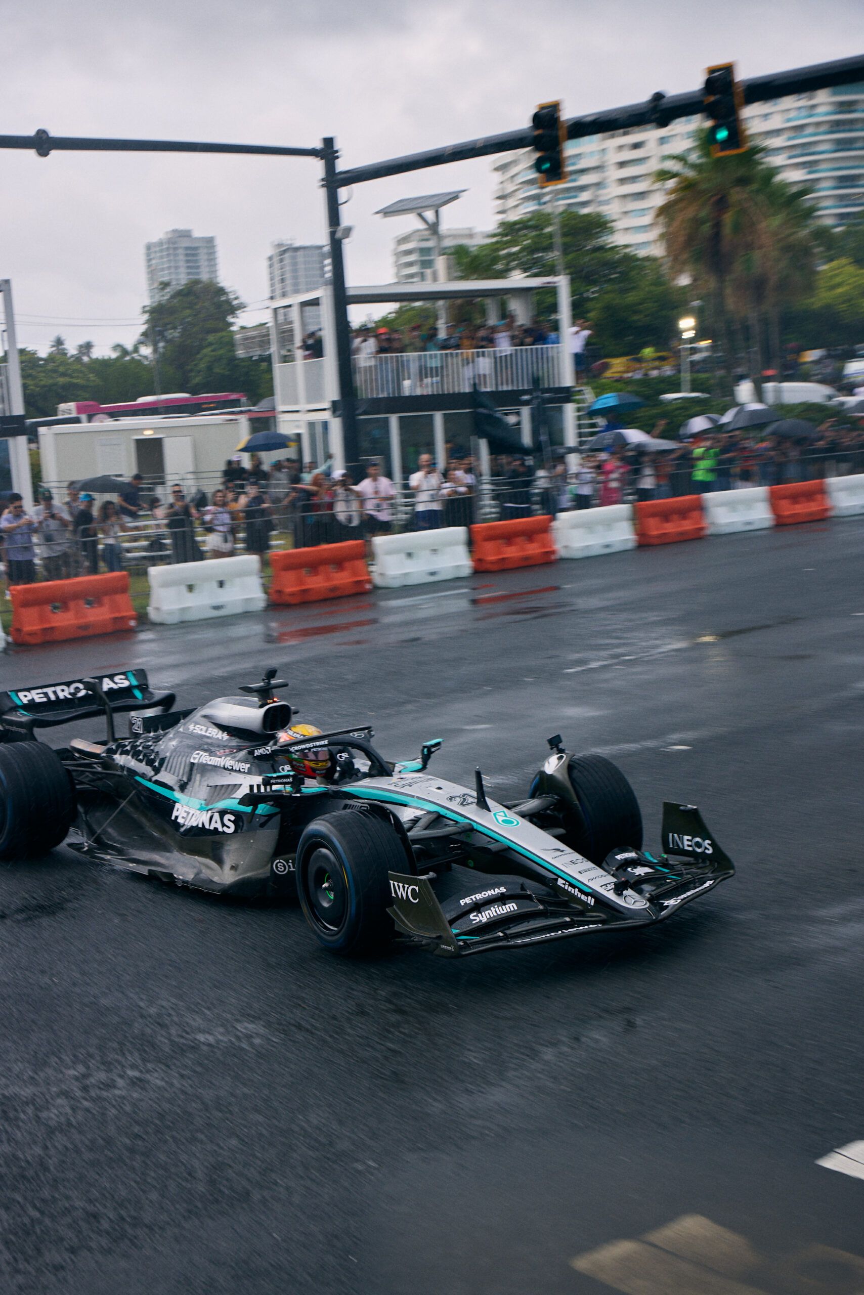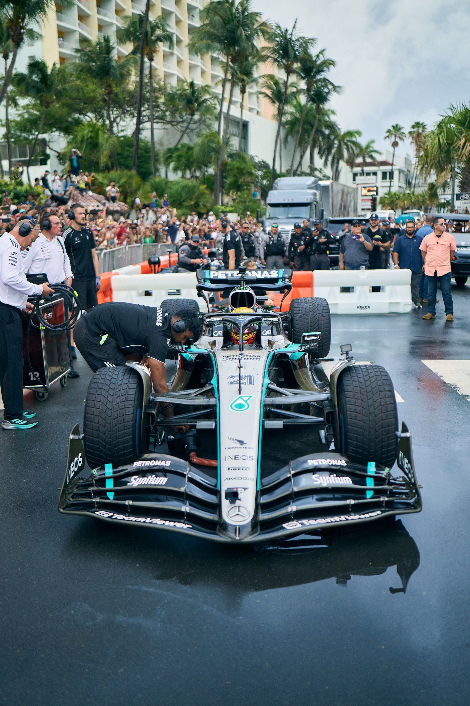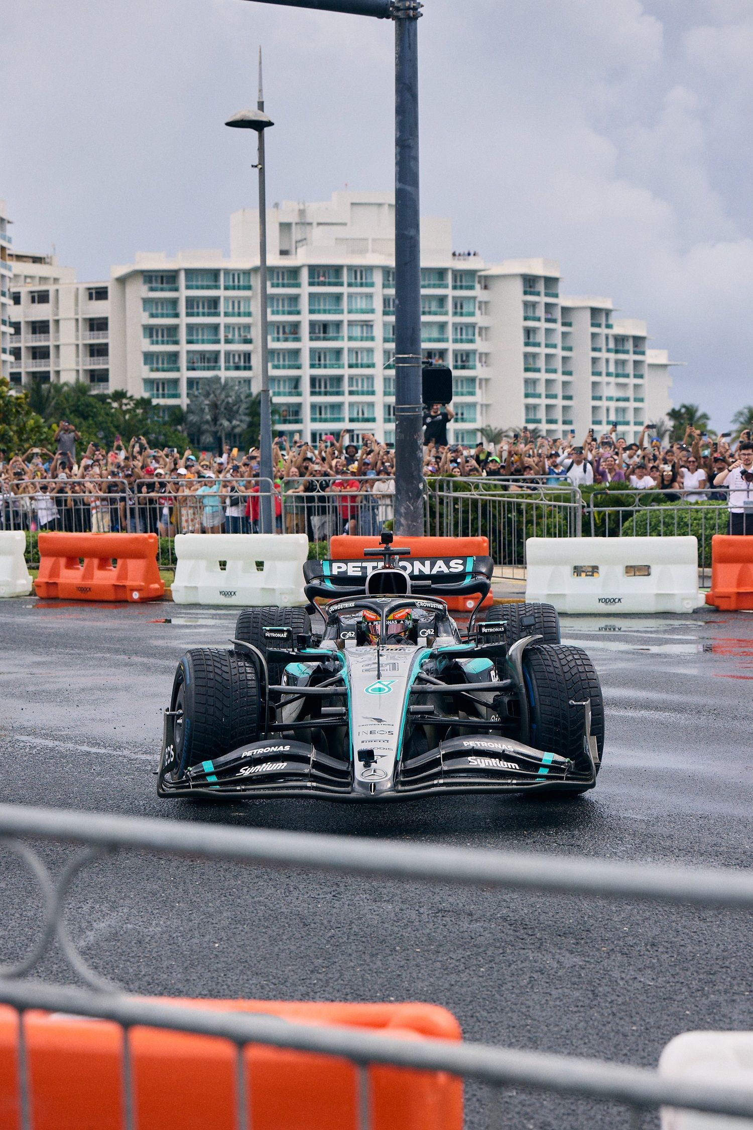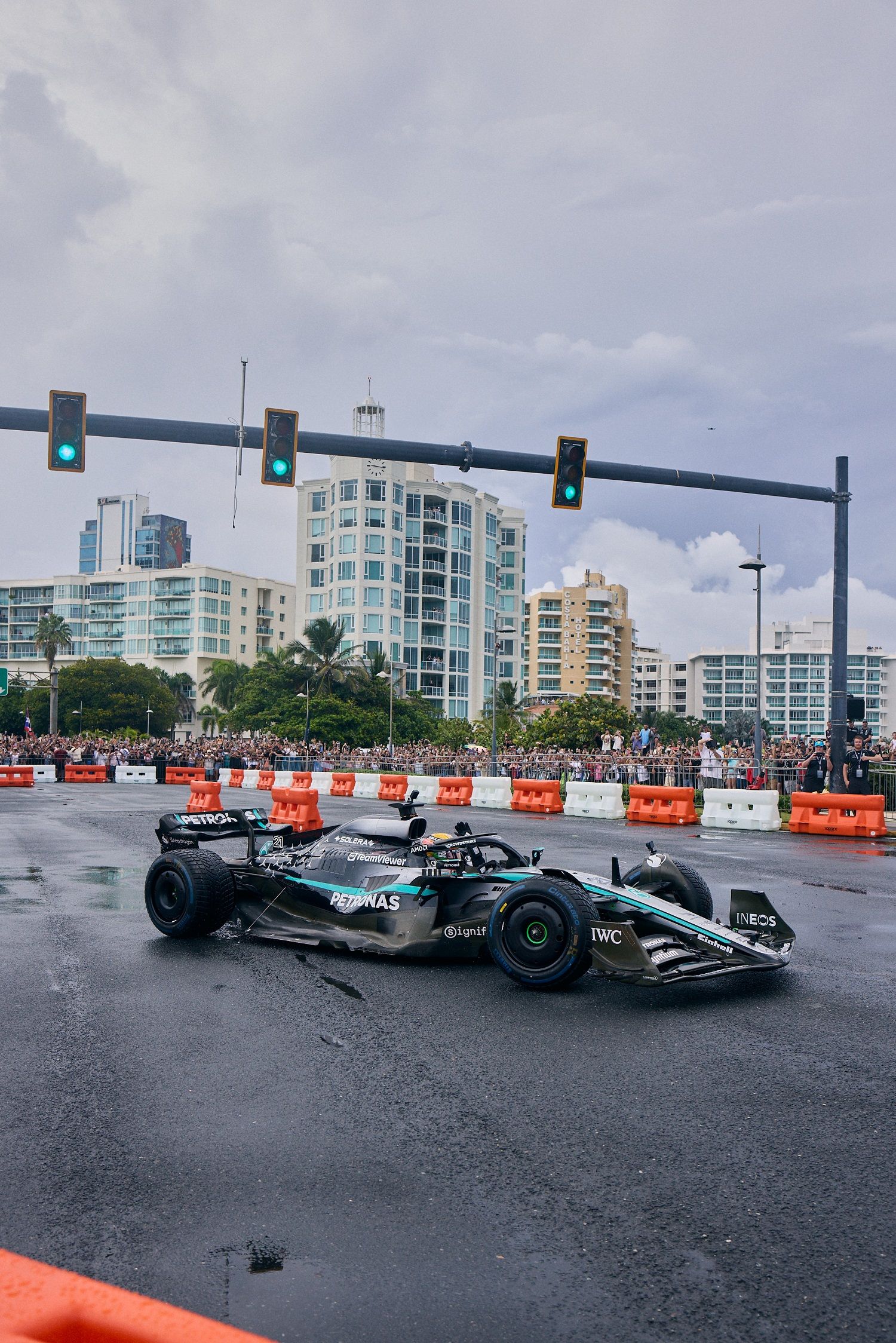 Mercedes held a special F1 showrun in Puerto Rico in association with adidas and singer Bad Bunny, with Esteban Gutierrez driving.