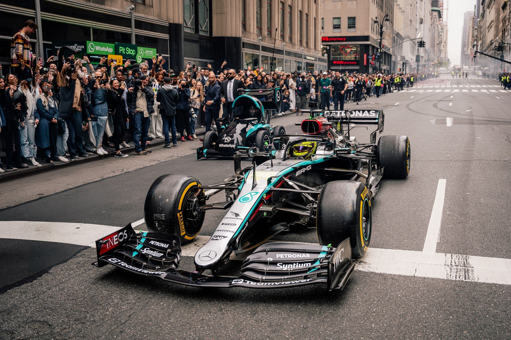 Mercedes undertook a special showrun with the W12 – driven by Lewis Hamilton – and real-version of emoji car near Empire State Building in New York.