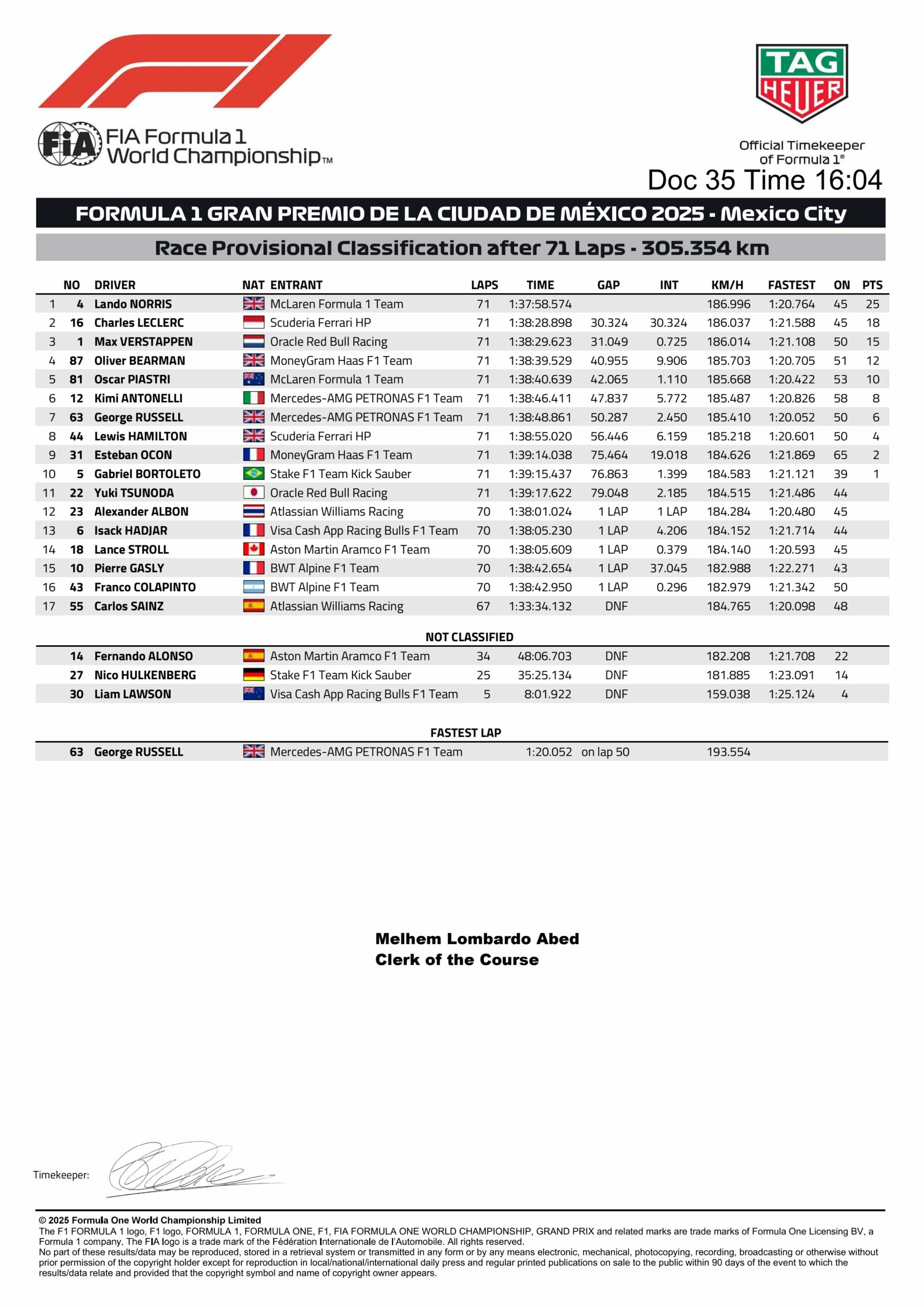 It was Norris in the lead to win Mexico GP by 30.324s margin and retook the F1 points lead by one point over Piastri. It was Leclerc hanging on to second from Verstappen by 0.725s margin, with Bearman securing his best result in fourth, keeping Piastri at bay.