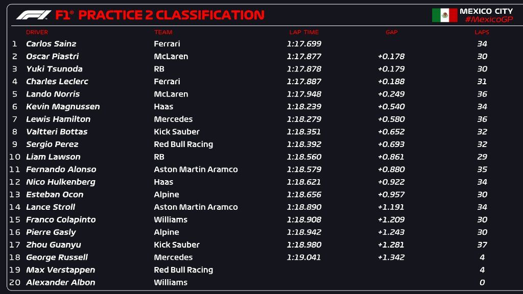 Carlos Sainz ended up fastest in FP2 of F1 Mexico GP which was dedicated for Pirelli tyre testing, as Oscar Piastri was P2 and Yuki Tsunoda remained P3.