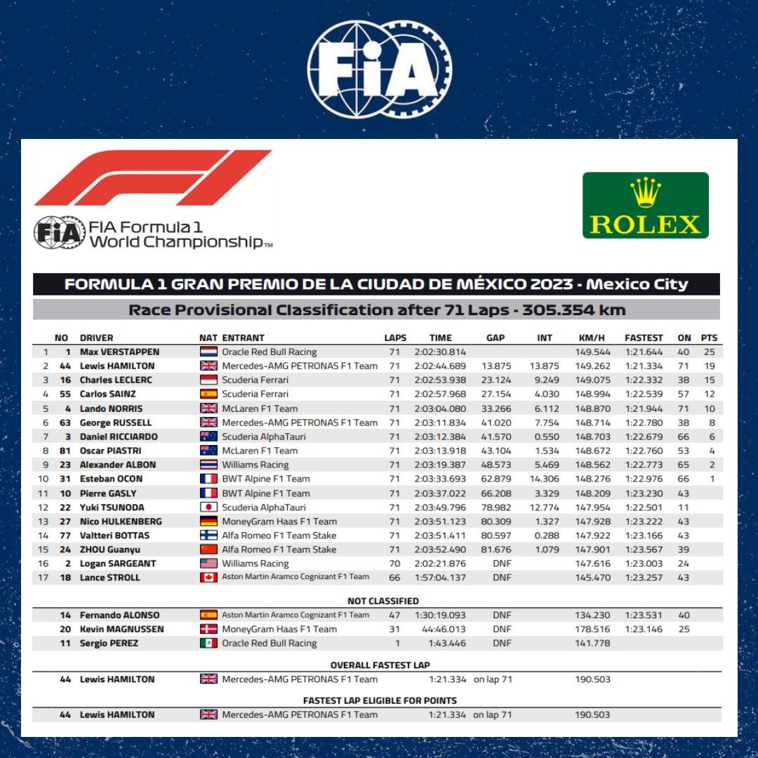 Leclerc was third from Sainz with Norris in fifth ahead of Russell who just resisted Ricciardo for sixth, as Piastri was eighth from Albon and Ocon in the Top 10. Teammate Gasly was 11th from Tsunoda, Hulkenberg, Bottas and Guany, with Sargeant classified in 16th despite pitting to retire on final lap due to fuel pump issue.