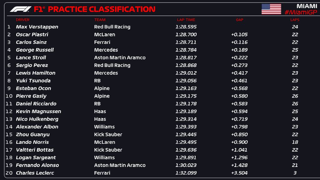 Max Verstappen led the way in FP1 of F1 Miami GP after a late dash ahead of Oscar Piastri and Carlos Sainz.