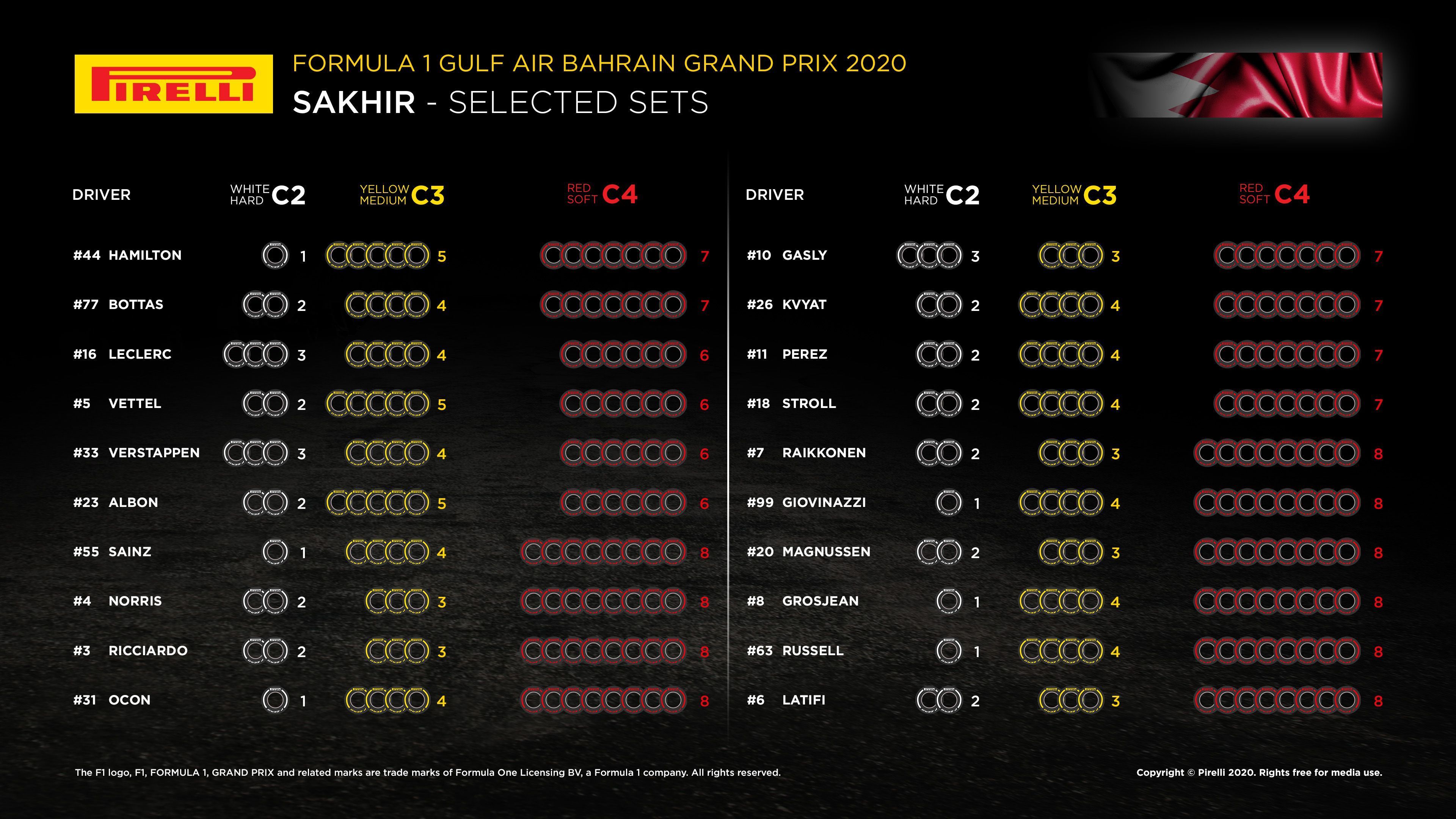 As known, Pirelli is bringing C2 (hard), C3 (medium) and C4 (soft) for the F1 Bahrain GP as teams/drivers have a mixed choice, where Mercedes duo have gone for seven sets of the soft compound which is same for AlphaTauri and Racing Point.