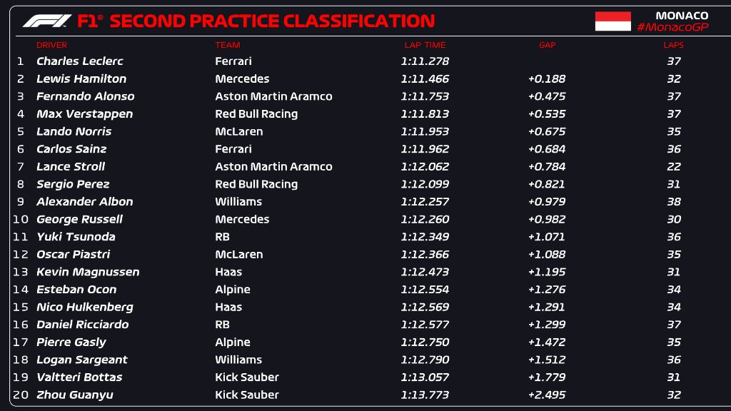 Charles Leclerc dropped Lewis Hamilton to second in FP2 of F1 Monaco GP, with Fernando Alonso rounding the Top 3.