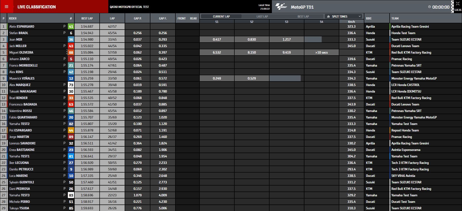 Avintia’s Enea Bastianini rounded out the Top 20, where Martin was the fastest MotoGP rookie. Yamaha’s Test Rider 1 was then 21st from Tech 3 KTM pair of Iker Lecuona & Danilo Petrucci, where Avintia Sky VR46’s Luca Marini slotted in 24th.