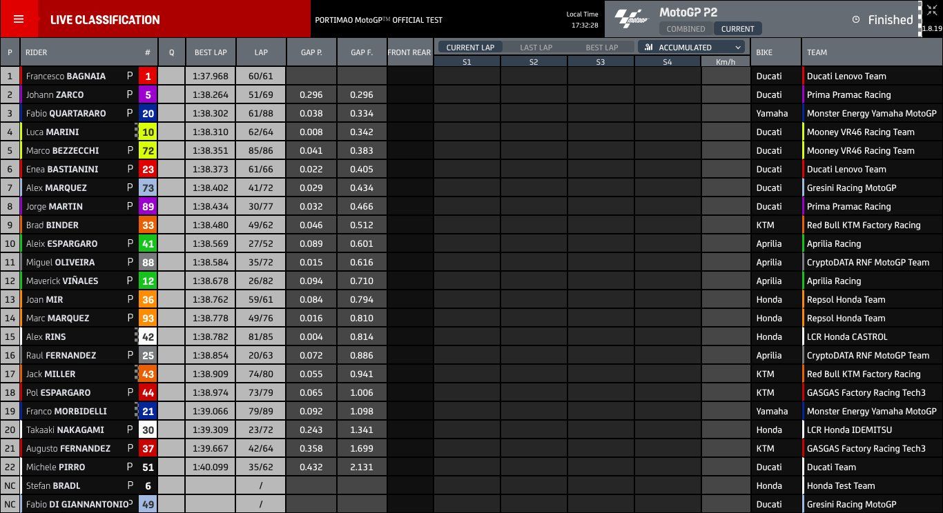It’s Mir who ends the Portimao Test as the quickest Honda in P13, 0.016s ahead of Marquez who in turn is 0.004s faster than Rins. They’re all within a second of the all-time lap record, a sign Honda are heading down the correct path. Nakagami finishes the Test down in P20, 1.3s from top spot.