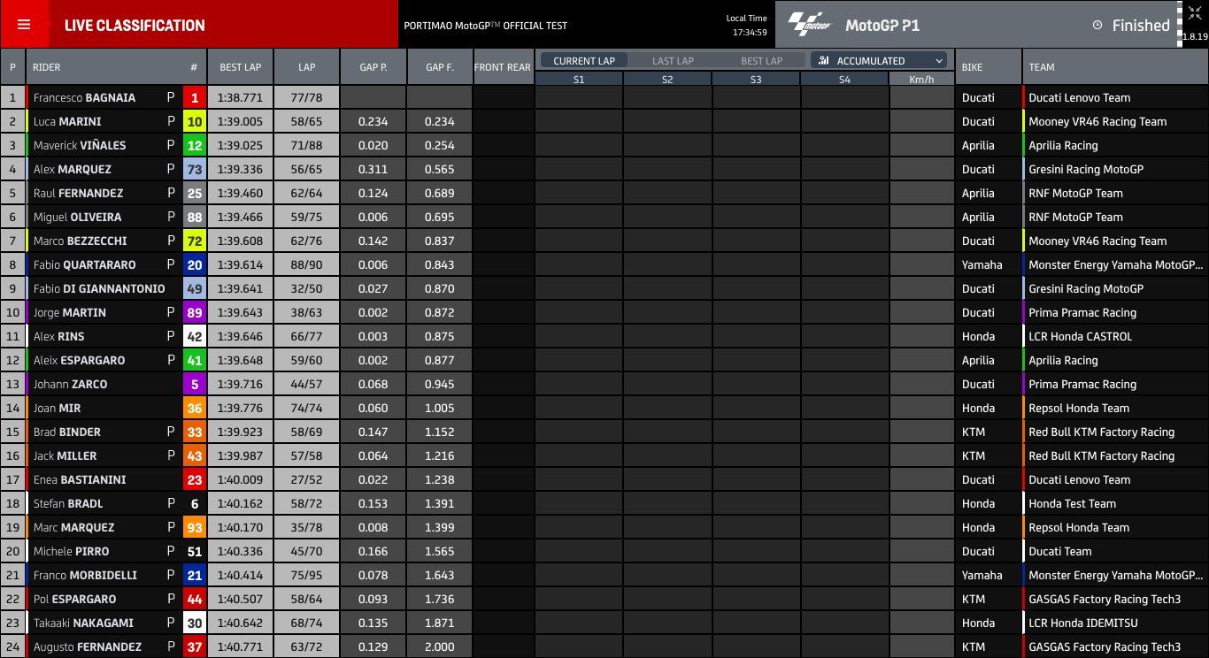 Completing the top ten was Jorge Martin (Prima Pramac Racing). He was seen with a different chassis, one that’s been spotted before and could be part of an ongoing experiment from Ducati. The number 89, meanwhile, went the opposite way to the factory duo elsewhere – putting in a whole lot of laps with the ground effect fairings. Teammate Johann Zarco was P13, not far off Martin by the end of Day 1.