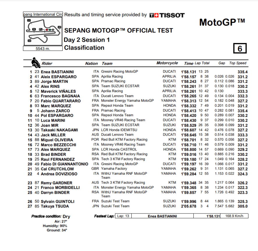 Pramac Ducati’s Martin was third with a 1m58.243s lap as the second Aprilia of Maverick Vinales rounded out the Top 5 behind Suzuki’s Alex Rins – the Top 3 from Day 1 maintaining their pace to be in the Top 5 on the final day as well.