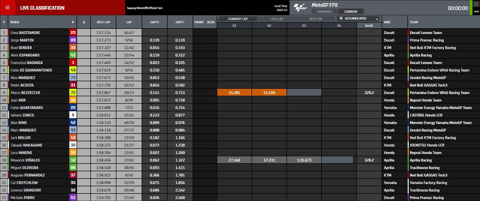 After an under-the-radar opening day in Sepang, the World Champion joined the party today. Bagnaia claimed the final spot inside the top five with a 1:57.469, leaving him just over three tenths behind his teammate.