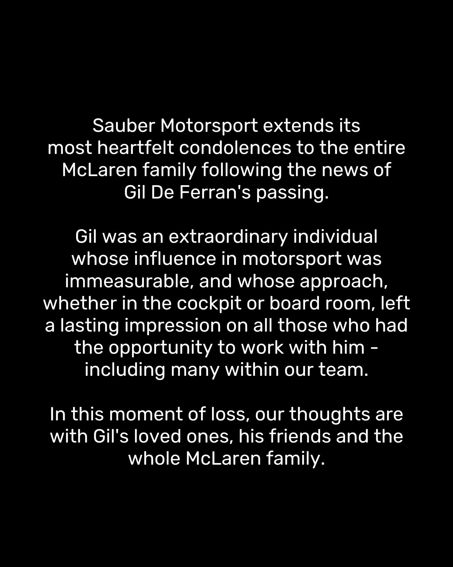Ferrari: “Everyone at Scuderia Ferrari is shocked and saddened at the sudden passing of Gil de Ferran who made a significant contribution to our sport. He was a great racer and competitor and a friend to all who knew him. We offer our sincere condolences to his family and to our colleagues at McLaren.”