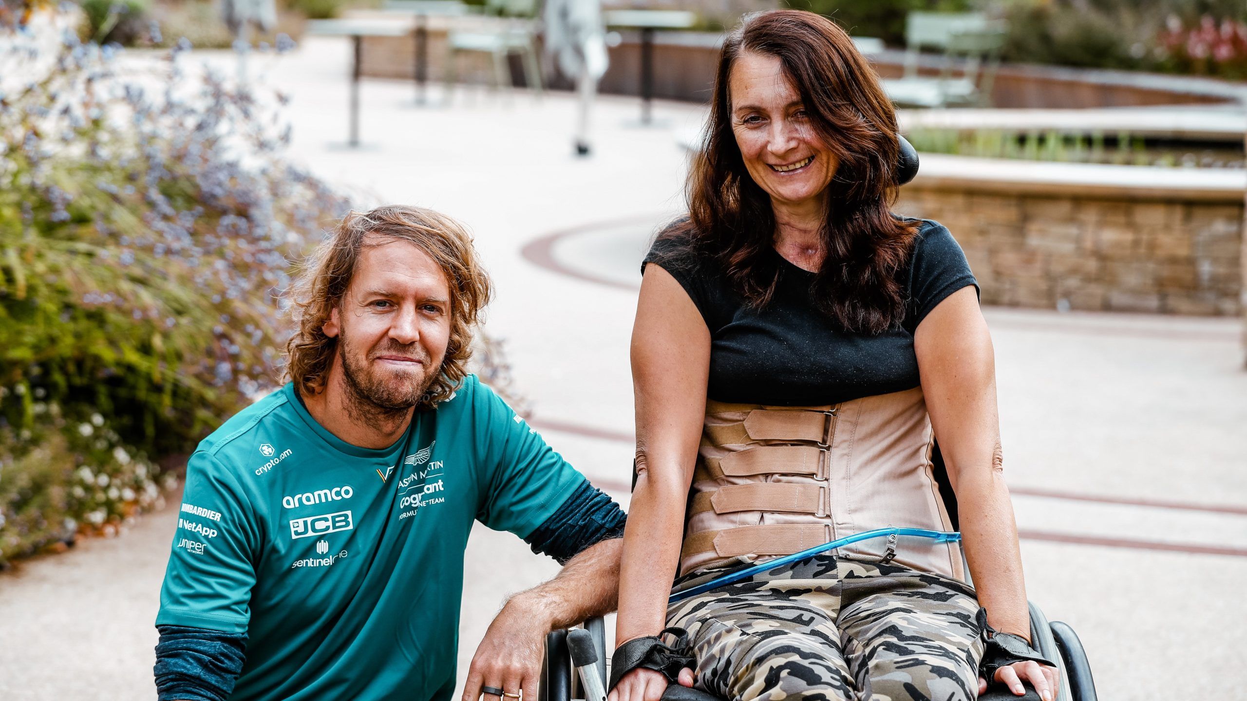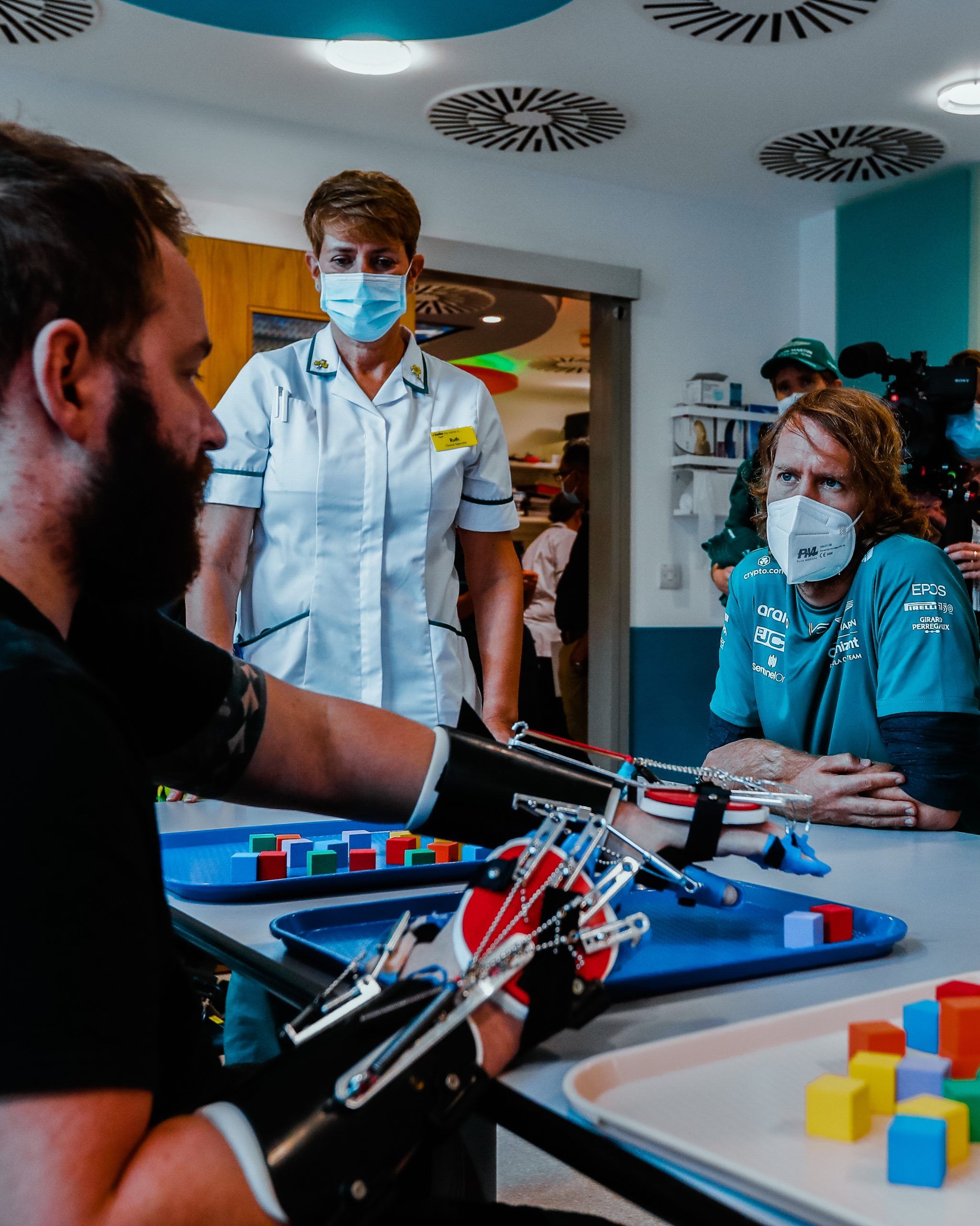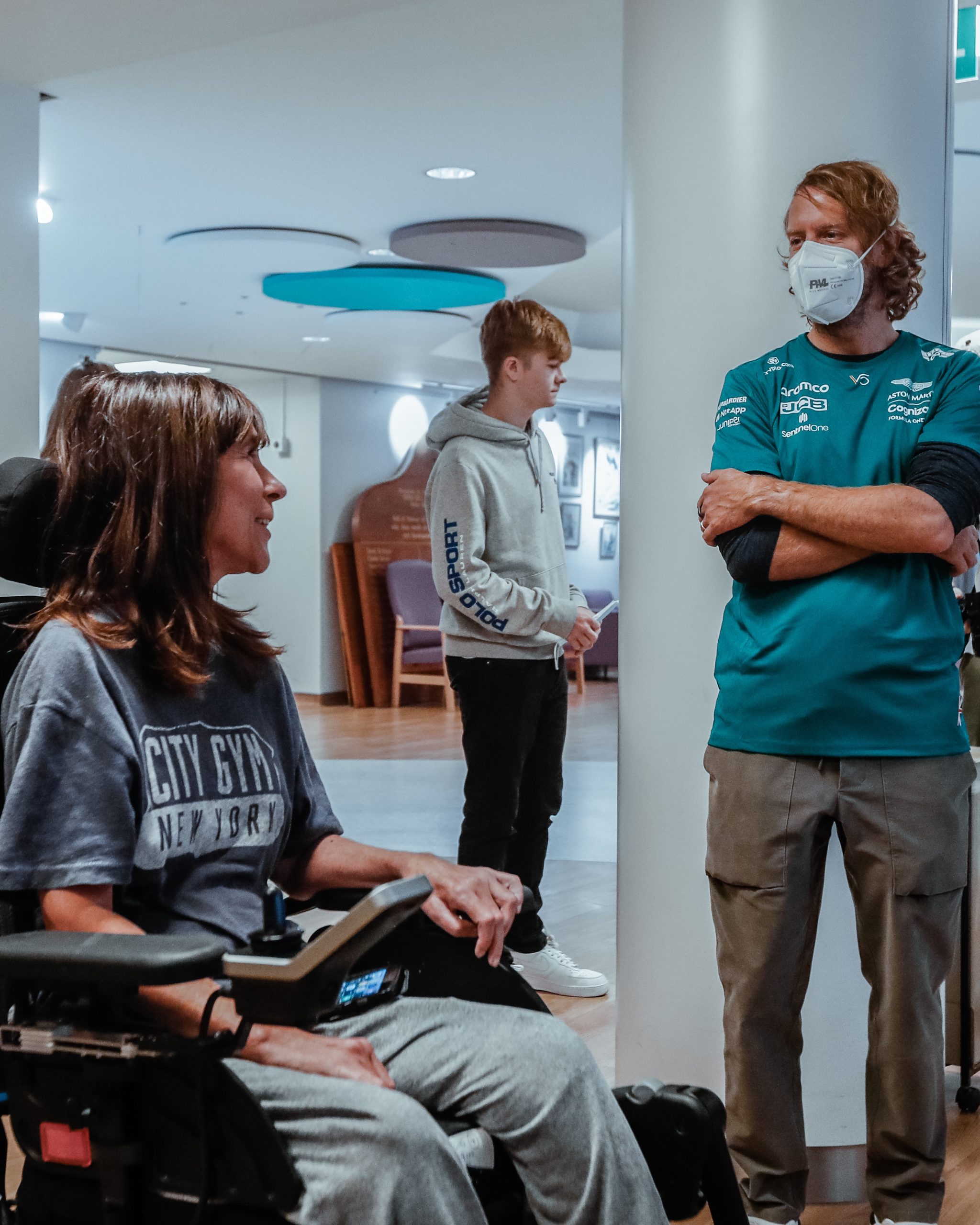 Aston Martin shared photos of Sebastian Vettel and the F1 team visiting the Stoke Mandeville Hospital in the UK to talk about spinal injuries.