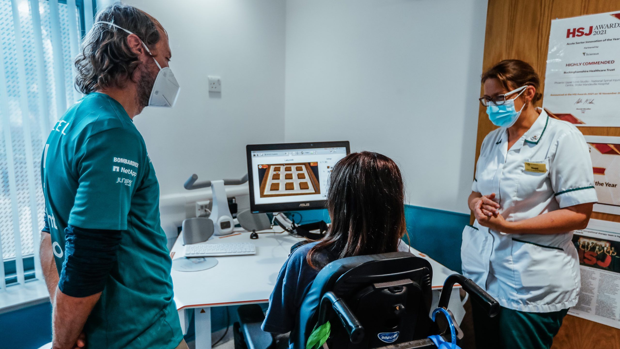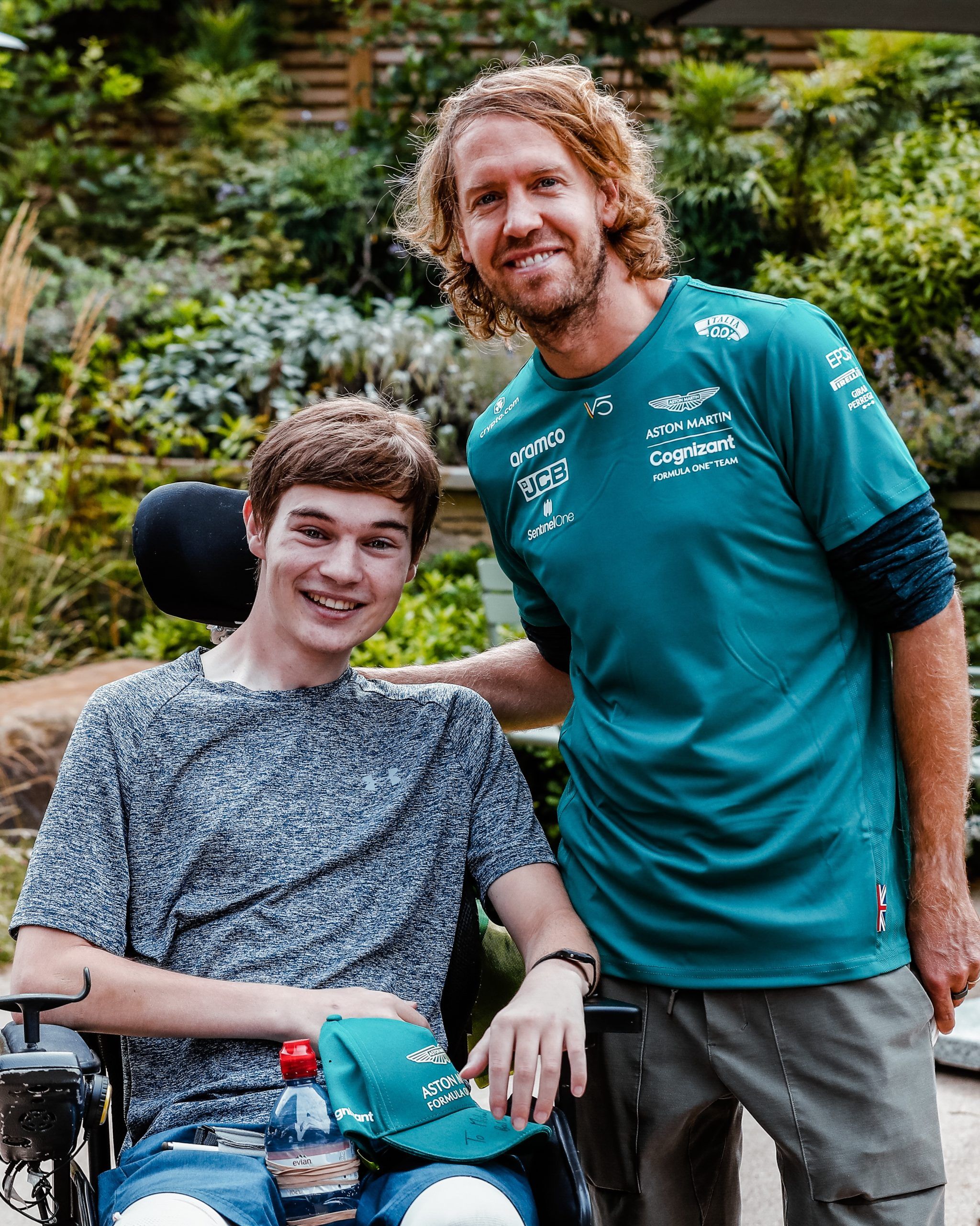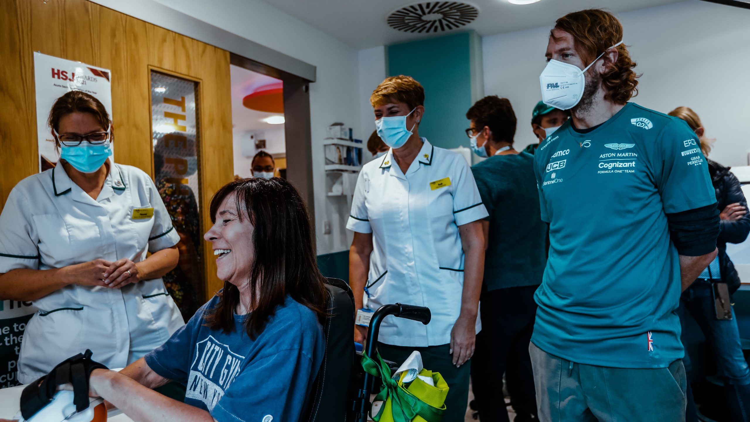 Aston Martin shared photos of Sebastian Vettel and the F1 team visiting the Stoke Mandeville Hospital in the UK to talk about spinal injuries.