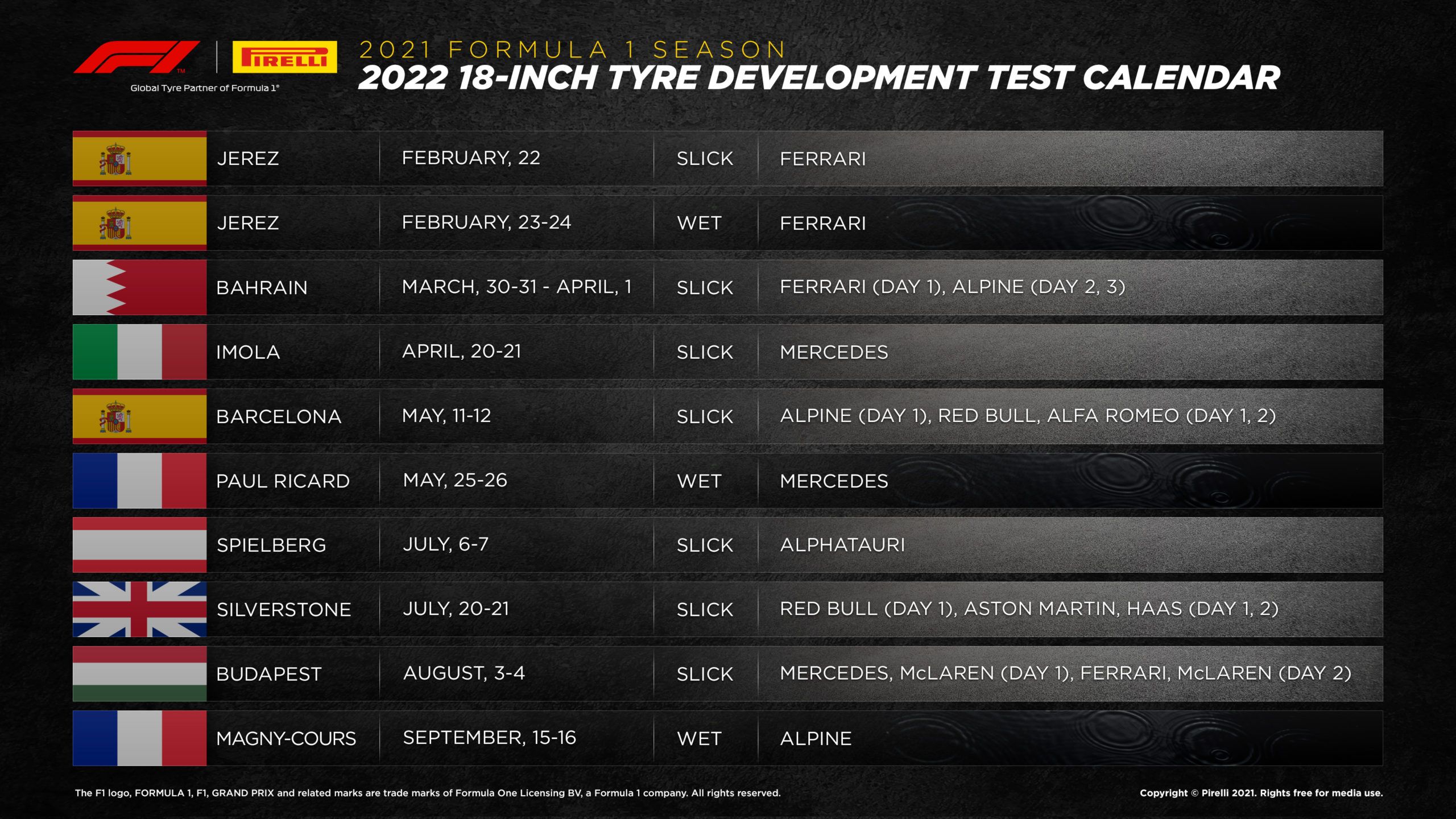 | Barcelona | May, 11-12 | Slick | Alpine (day 1), Red Bull, Alfa Romeo (day 1-2) |