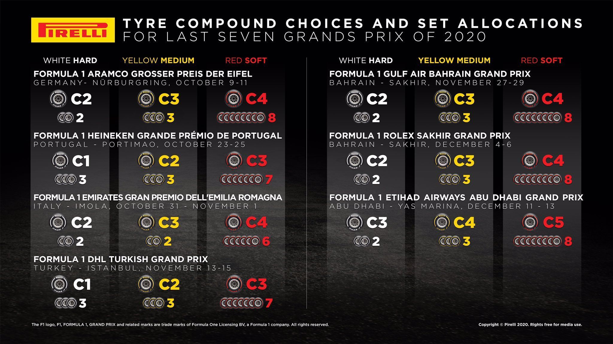 Having already released the details of the first 10 F1 races, Pirelli has now confirmed the three compounds for the remaining seven races to be held in Italy, Germany, Portugal, Turkey, Bahrain and Abu Dhabi – including the double-header.