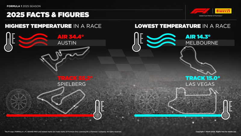 The number of tyre sets supplied by Pirelli over the course of the season highlights the logistical complexity of motorsport’s pinnacle. In 2025, teams had access to 6,120 sets of slicks in total, comprising 1,800 sets of C5, 1,580 sets of C4, 1,400 sets of C3 and around 1,900 wet weather tyres. The number of tyres allocated to each car, which varies depending on the weekend format, is clearly defined by the technical regulations. As always, temperatures also influenced tyre behaviour. The highest track temperature recorded during a session was 58.2 degrees centigrade at Jeddah during FP2, while the highest air temperature was 39.1 degrees centigrade in Bahrain during FP1.