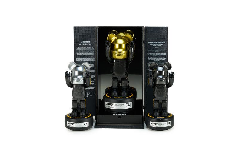 Heroo was created by the Italian artist and designer Matteo Macchiavelli, in collaboration with Pirelli Motorsport. It is an interpretation of the connection between the racing car and its tyres, while also being an artwork that links beauty and elegance with the excitement, sense of speed and quality of the materials that go into a Formula 1 car. The trophy takes the form of a human silhouette with arms raised in triumph, the whole encased in carbon fibre, sitting on a rubber base. The ones for the Grand Prix winning driver and team representative stand out with the helmet painted in golden yellow, sprinkled in gold dust, while silver and titanium are the colours and finish chosen for the second and third placed drivers respectively. The Austin podium will not be a one-off appearance for Heroo, as replicas will be produced in a limited production run for collectors and fans of collectible art toys.