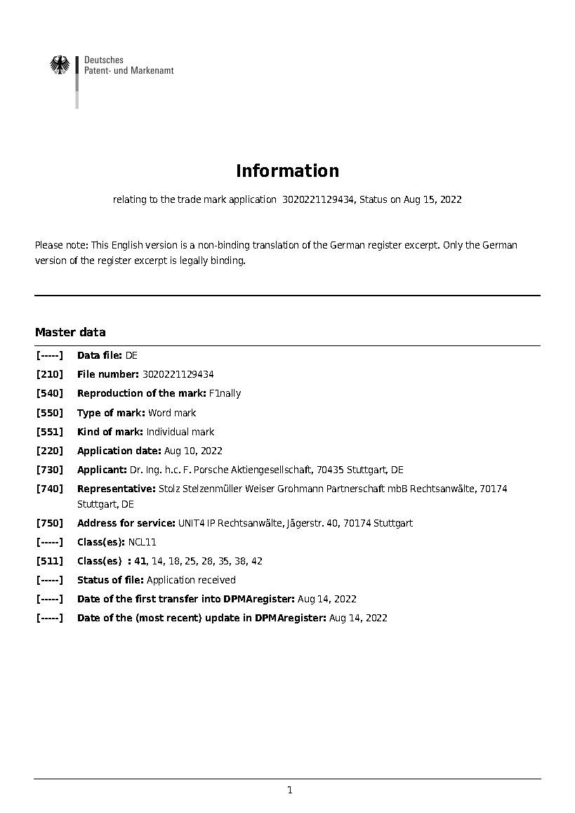 Porsche has seemingly filed a trademark for ‘F1nally’ on August 10 which has been firmed on August 15 as per the document. It is a step towards their apparent confirmation to join the F1 grid in partnership with Red Bull under 2026 engine regulation.