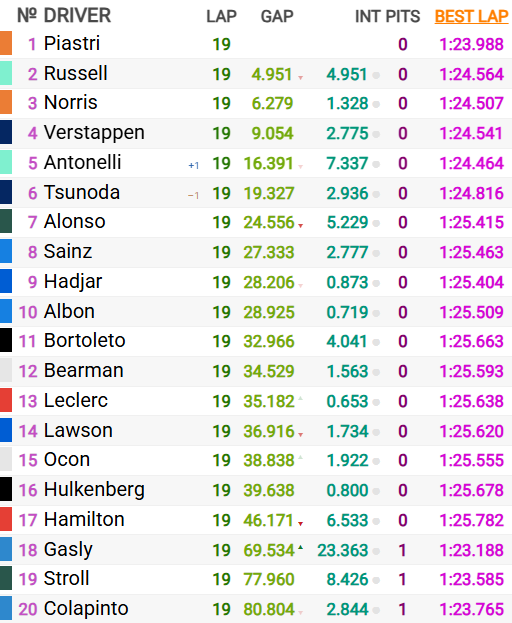 Russell retained second from Norris, with Verstappen in fourth. Tusnoda was fifth but ended up sixth after his penalty, with Antonelli taking fifth. But post-race, the penalty on the Italian was applied to drop him to sixth again, with the Japanese retaking fifth place in a good result for him.