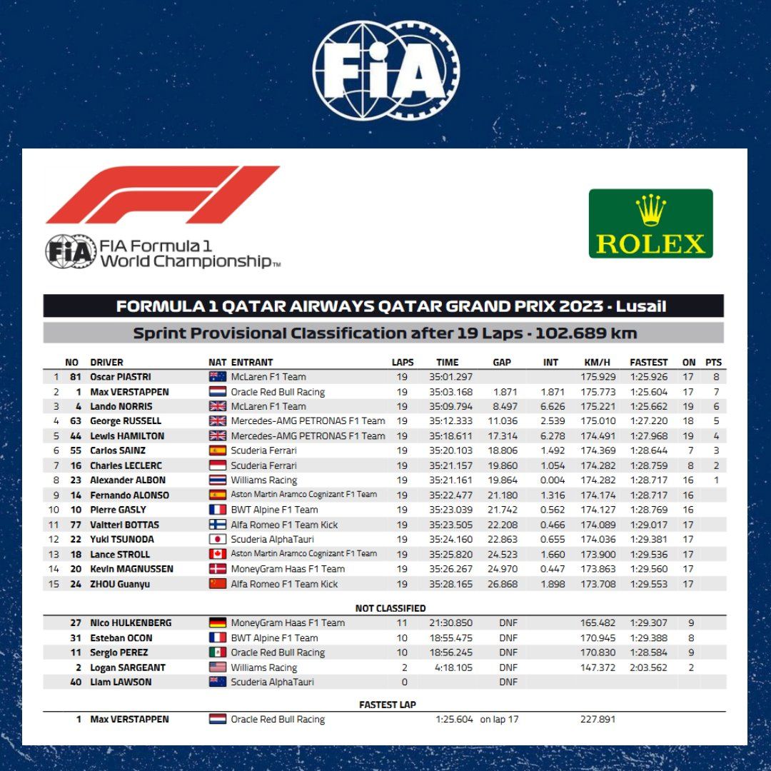 Oscar Piastri secured his first F1 win in Qatar GP sprint ahead of now 2023 champion Max Verstappen with Lando Norris in third.