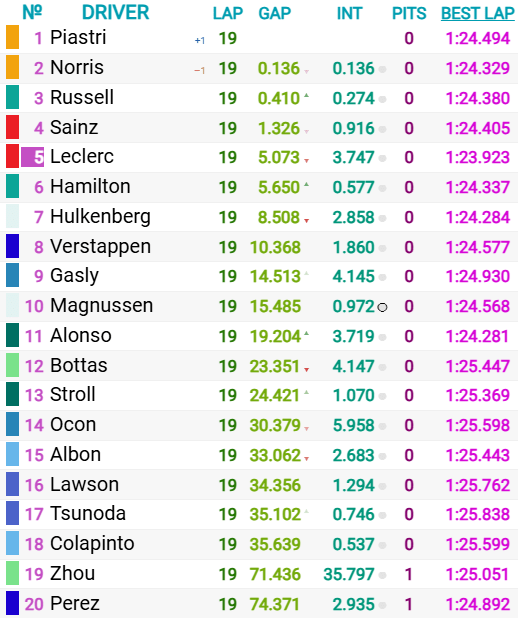 The gainer among all this was Haas’ Kevin Magnussen, who was up to 10th, while Visa Cash App RB dropped from the Top 10 to 16th. Norris kept on helping Piastri and the moment he left him alone, Russell pounced on him, where the Australian had to bring out the aggressive defence.
