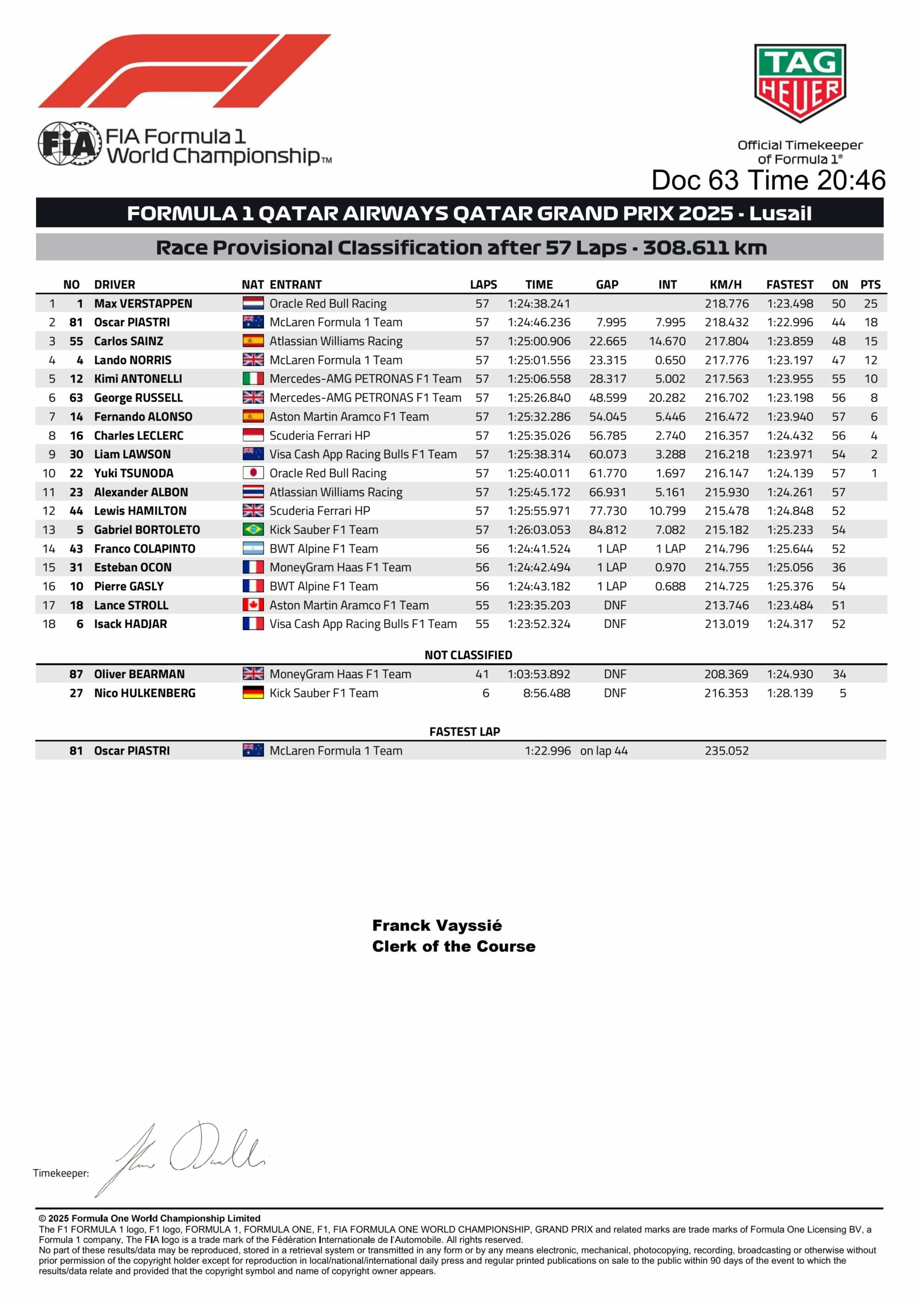 The Brit got Antonelli after a moment for the Italian, who was closing in on Sainz. The Spaniard complained of a potential issue. In the end, Verstappen took the F1 Qatar GP win by 7.995s margin over Piastri, as Sainz scored his second podium of the 2025 season.