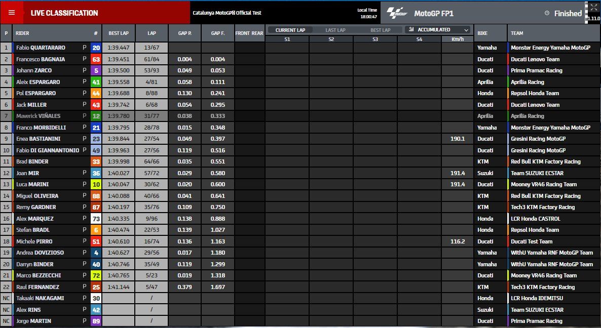 LCR Honda’s Alex Marquez was 16th where he tested a new swingarm, with Honda’s Stefan Bradl in 17th after ending his day early. Ducati tester Michele Pirro was 18th from RNF pair of Dovisioso and Darryn Binder, as VR46’s Marco Bezzecchi was 21st and Tech 3’s Raul Fernandez 22nd.