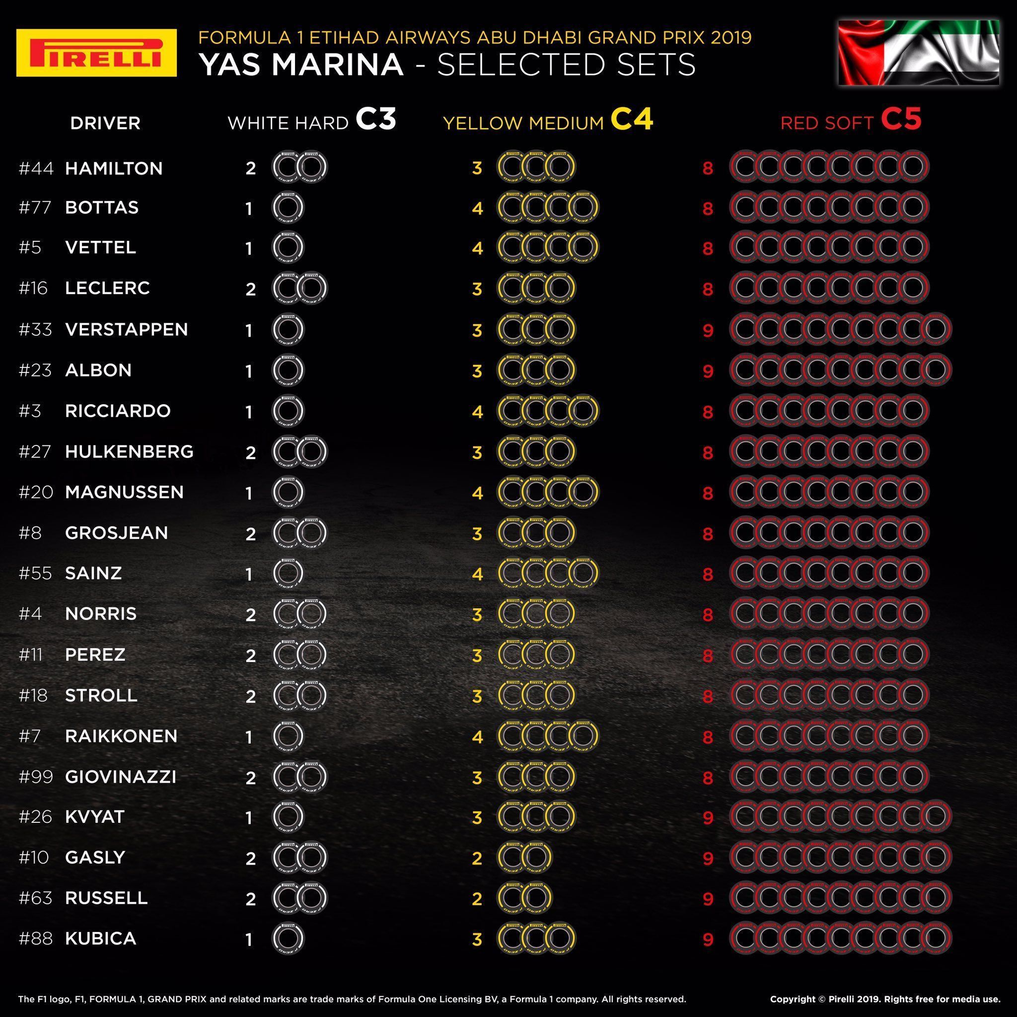 Both the Red Bull drivers have opted for three sets of medium and one of hard which is same for Daniil Kvyat and Robert Kubica, while Pierre Gasly and George Russell have two each of medium and hard compound for the final race of the 2019 F1 season.
