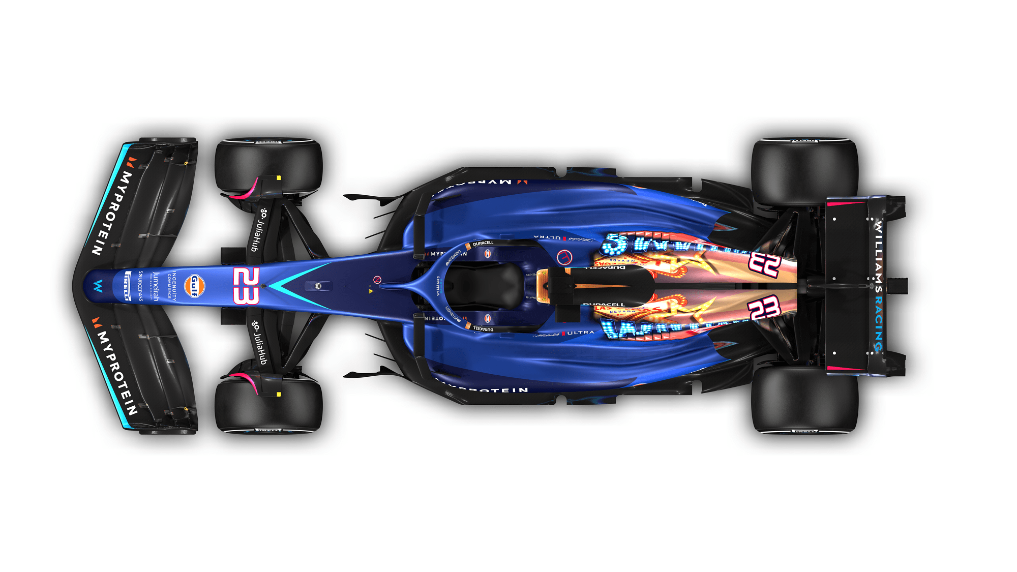 Williams Racing is delighted to unveil its special livery for the 2023 Las Vegas Grand Prix, marking the sport’s return to Sin City for the first time in over 40 years. The livery takes inspiration from the famed showmanship of Vegas, featuring the ‘Welcome to Fabulous Las Vegas’ sign and the cabochon lights that have brought the desert to life throughout its history.
