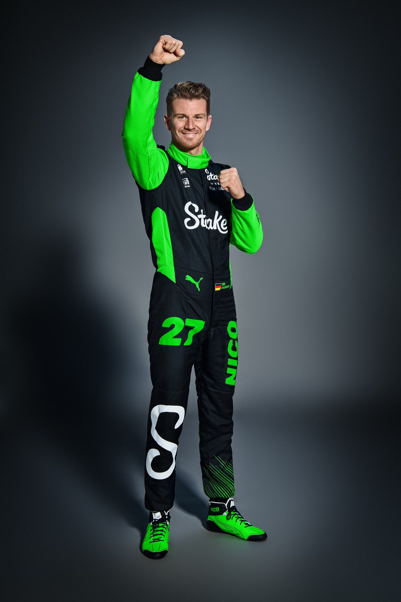 After the team showed its team wear for the 2025 F1 season, Sauber has presented the race suits of Nico Hulkenberg and Gabriel Bortoleto which retains Stake’s corporate colour of florescent green and black – but there is a design tweak from last year.