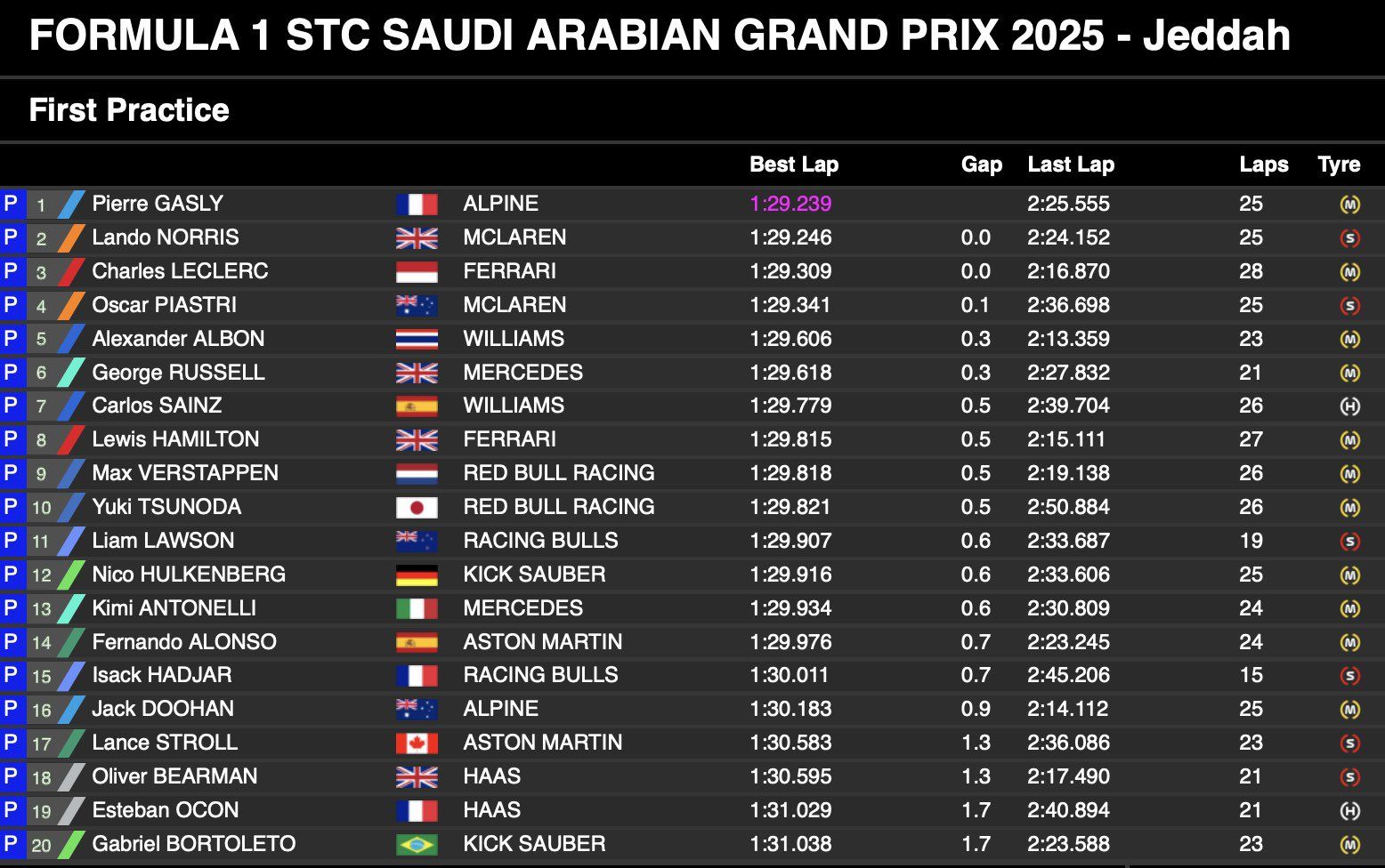 Pierre Gasly surprised the field by topping FP1 in F1 Saudi Arabian GP by close margin over Lando Norris, as Charles Leclerc popped up in third.