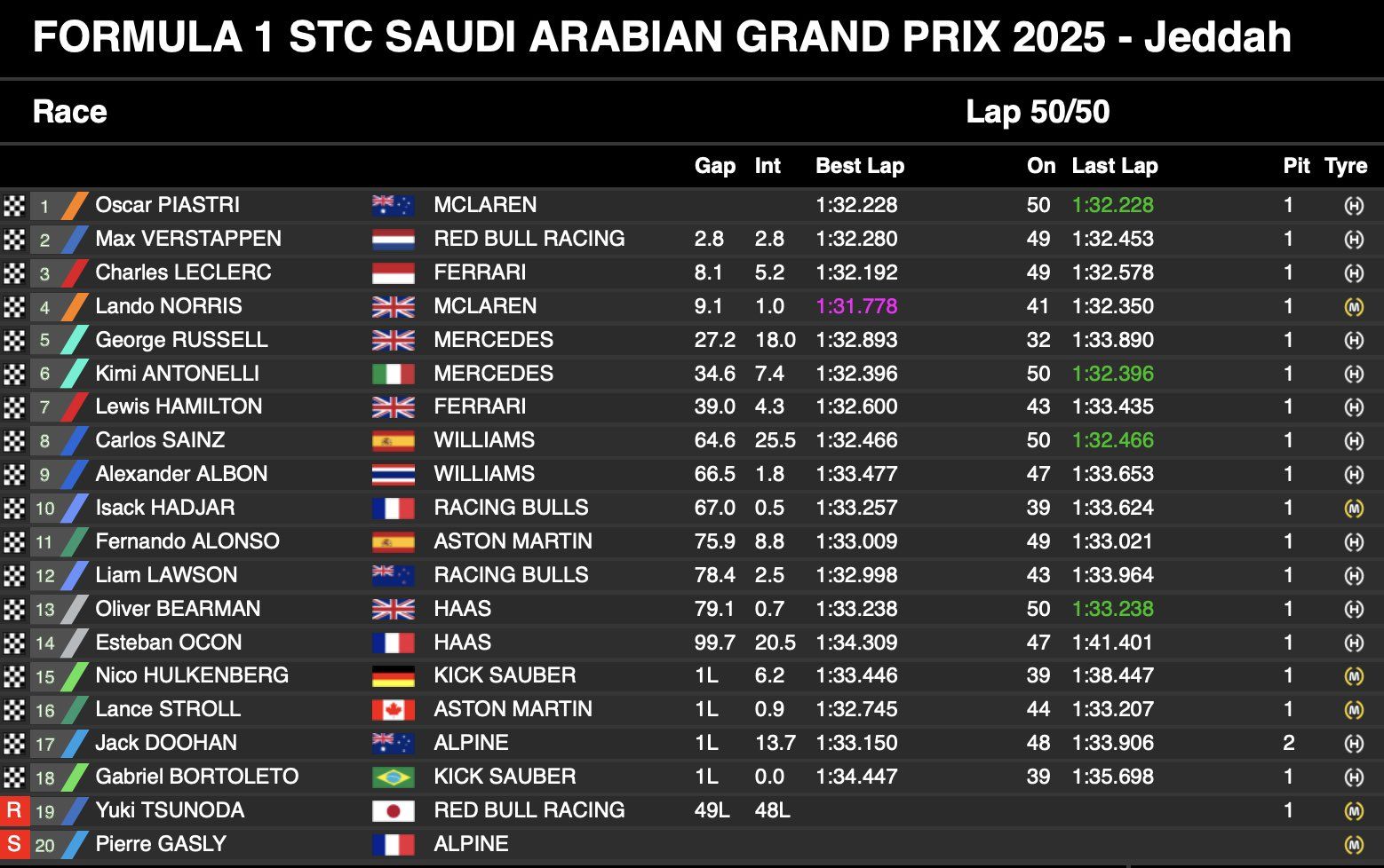 Oscar Piastri managed to get through Max Verstappen to win F1 Saudi Arabian GP, as Charles Leclerc secured first podium of 2025.