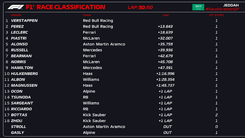 Hulkenberg ran 10th from teammate Magnussen, with Ocon not far behind along with Albon and Tsunoda. At the front, it was comfortable win for F1 Saudi Arabian GP in yet another Red Bull 1-2 with quite a distant from Perez in second.